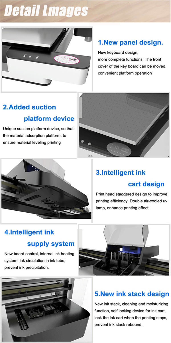 Print head staggered design to improve printing efficiency. Double air-cooled uv lamp, enhance printing effect